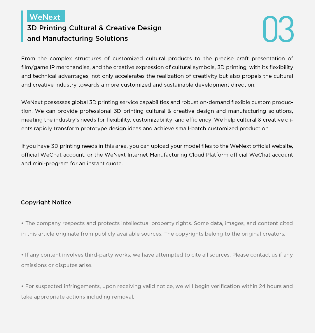 3D printing technology is reshaping the landscape of the cultural and creative industries in application scenarios such as customized cultural product creation, film & TV IP derivative development, and game merchandise production.