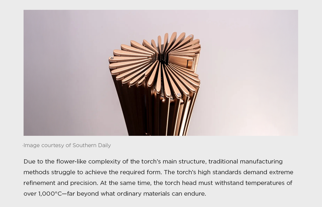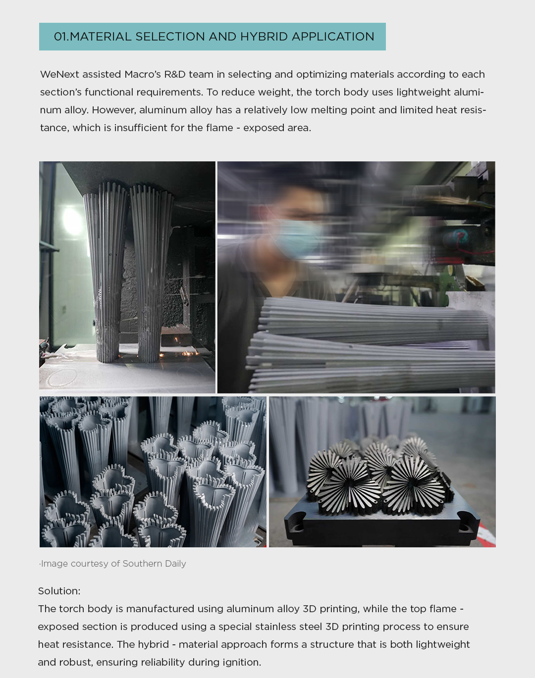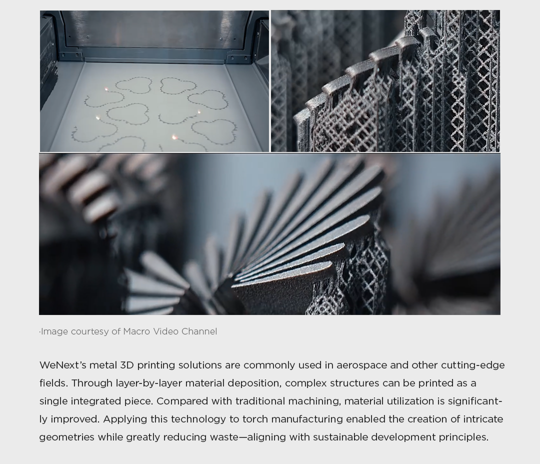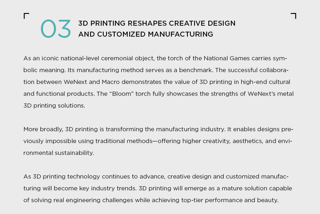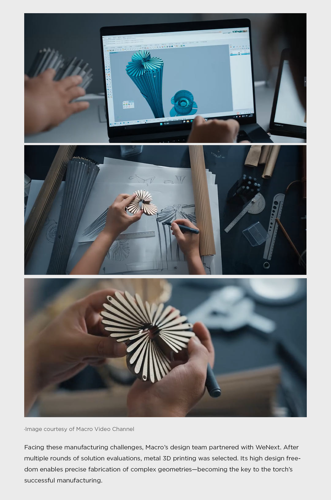 Decoding the manufacturing journey of the “Bloom” torch for the 15th National Games, WeNext broke through the bottlenecks of traditional processes through metal 3D printing technology, transforming Macro’s design concept into reality.